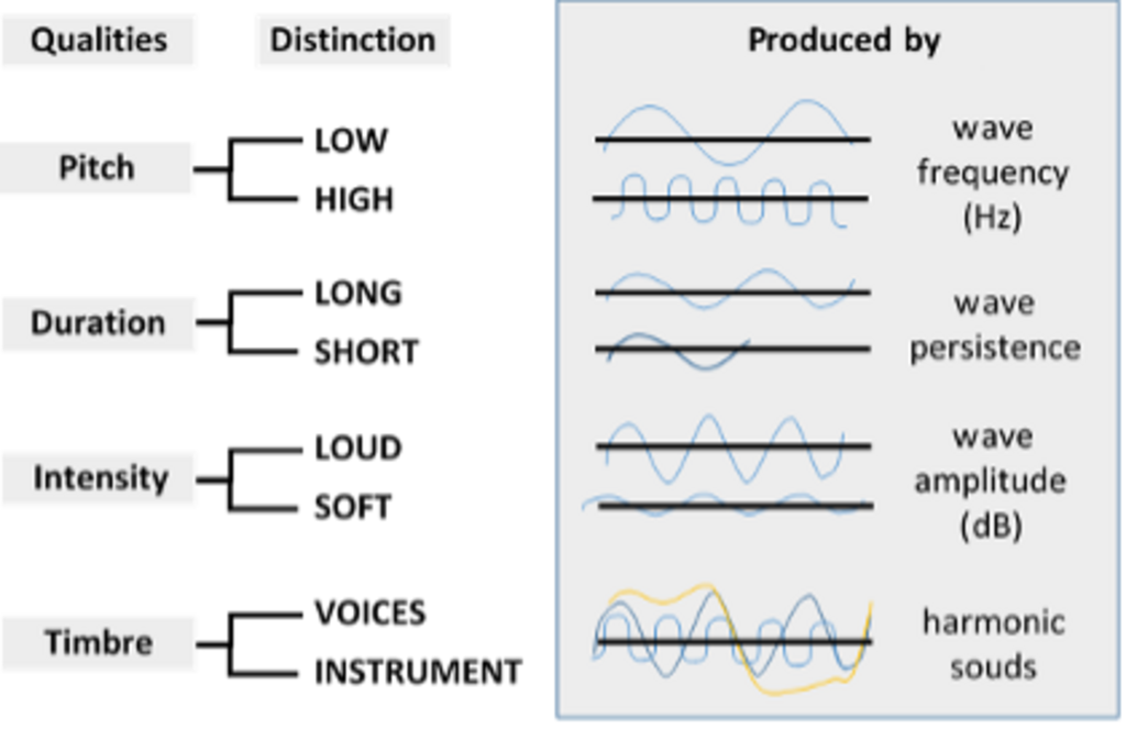 Auditory displays may emit sound with different quality characteristics (Figure 1). These characteristics are related to frequency, intensity (loudness), duration, pitch of sound or in the duration of the intervals between discrete sounds.