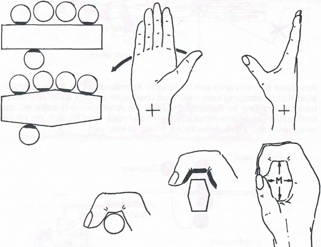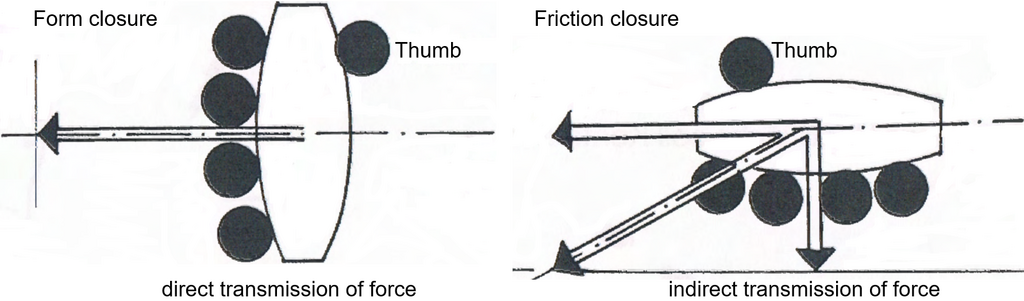 With a necessary increase of the actuating force, the type of gripping usually changes from the contact grip to the wrap-around (clench) grip or to the pedal type.