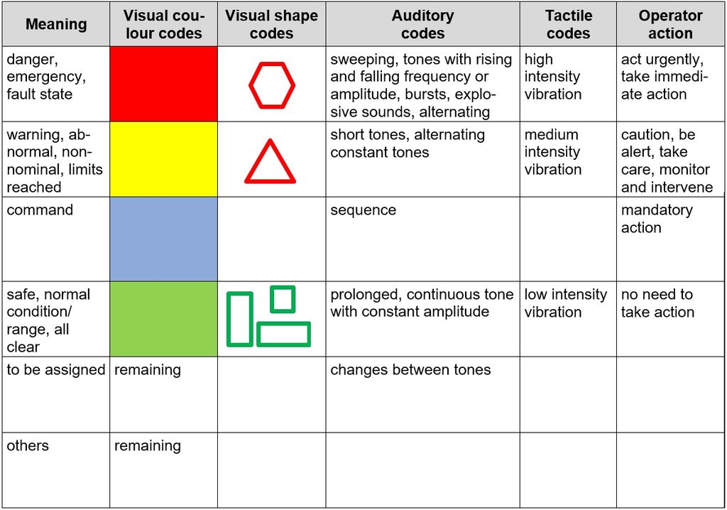 Table 1. Scheme for coding visual, auditory, and tactile signals (Note: combinations are possible, context relevant standards may apply).