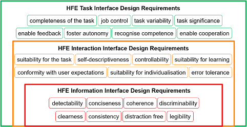 The selection of design requirements as presented in Figure 1 refer to the design of interfaces and support human factors and ergonomics as well as occupational safety and health in work system design.