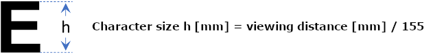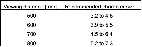 - Viewing distance, ambient environmental factors such as illumination and vibration, contrast between characters and background and the overall legibility of the characters will all affect character size and proportion. This should result in increased character height.